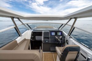 The cockpit of the W11, similar to the W9, offers superior protection with a large window screen and seating for three. The standard open boat is equipped with a targa, but an optional large electric sun-top similar to that of the T11 can also be added.